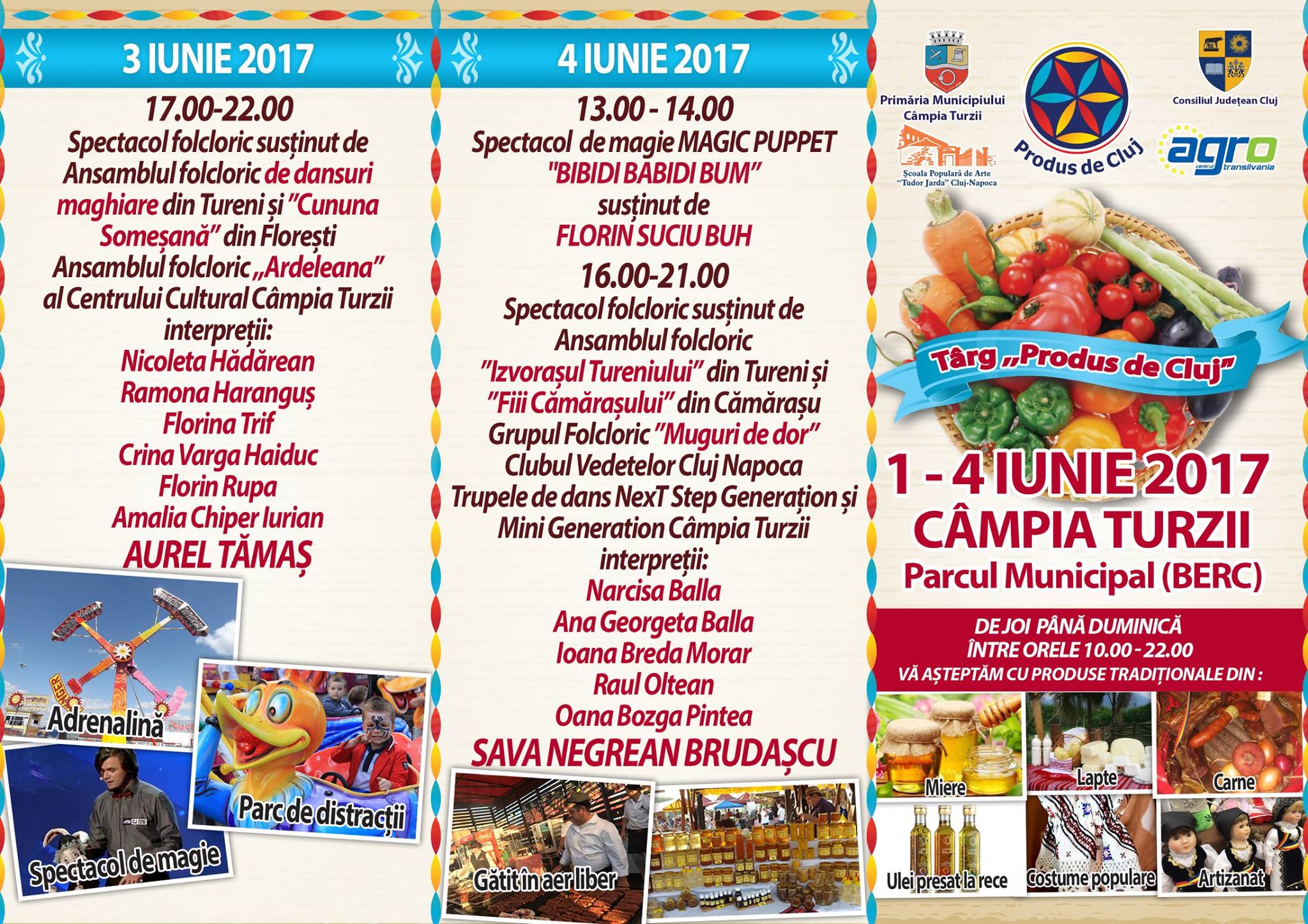 Târgul Produs de Cluj aduce la Câmpia Turzii o serie de surprize şi pentru cei mari, de la produse alimentare pe bază de lapte carne, miere de albine, uleiuri presate la rece, sucuri şi dulceţuri naturale, până la prăjituri şi ciocolată de casă. Pe standurile producătorilor clujeni veţi găsi şi vinuri, produse pe bază de lavandă, costume populare, bijuterii confecţionate manual şi obiecte sculptate în lemn. Toate acestea sunt realizate de mici întreprinzători clujeni, contributori la economia locală. Lor li se va alătura cel mai dotat şi spectaculos parc de distracţii din Transilvania, utilat şi pentru cei mici, dar şi pentru cei mari, dornici de senzaţii tari, precum şi bucătari pricepuţi, care vor găti în aer liber şi vor oferi vizitatorilor preparate la grătar la terasele special amenajate.